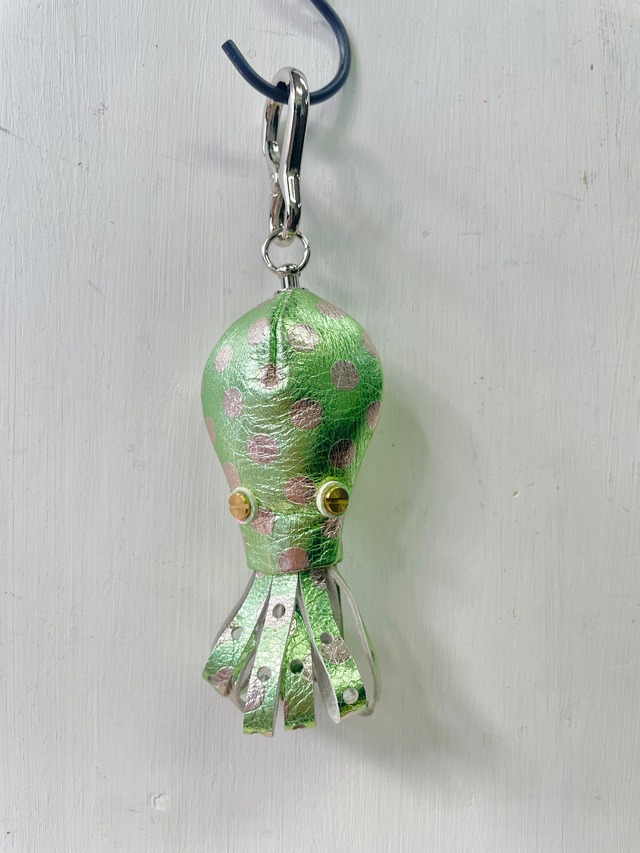 たこさんの大きめバッグチャームに新色登場。 綺麗なイエローグリーンのパールレザーにドット柄が入ったかわいい革です! まるでメロンソーダのような爽やかなたこさんが出来ました。 シンプルなトートバッグやリュックなんかに付けると、存在感大でとってもかわいいです。 目の色と革の色の組み合わせが違うので、どれも1点ものです。 たこさんの目には真鍮を使用していますので、だんだんと深い色に変化していきます。 胴体部分には綿が入ってるので、フカフカしててとっても癒されます✨ 人とは違うものが好きなご友人へのプレゼントにもおすすめです。 カラー:melon soda サイズ:3cm×3cm×12cm(金具部分含めず) 素材:ステアレザー