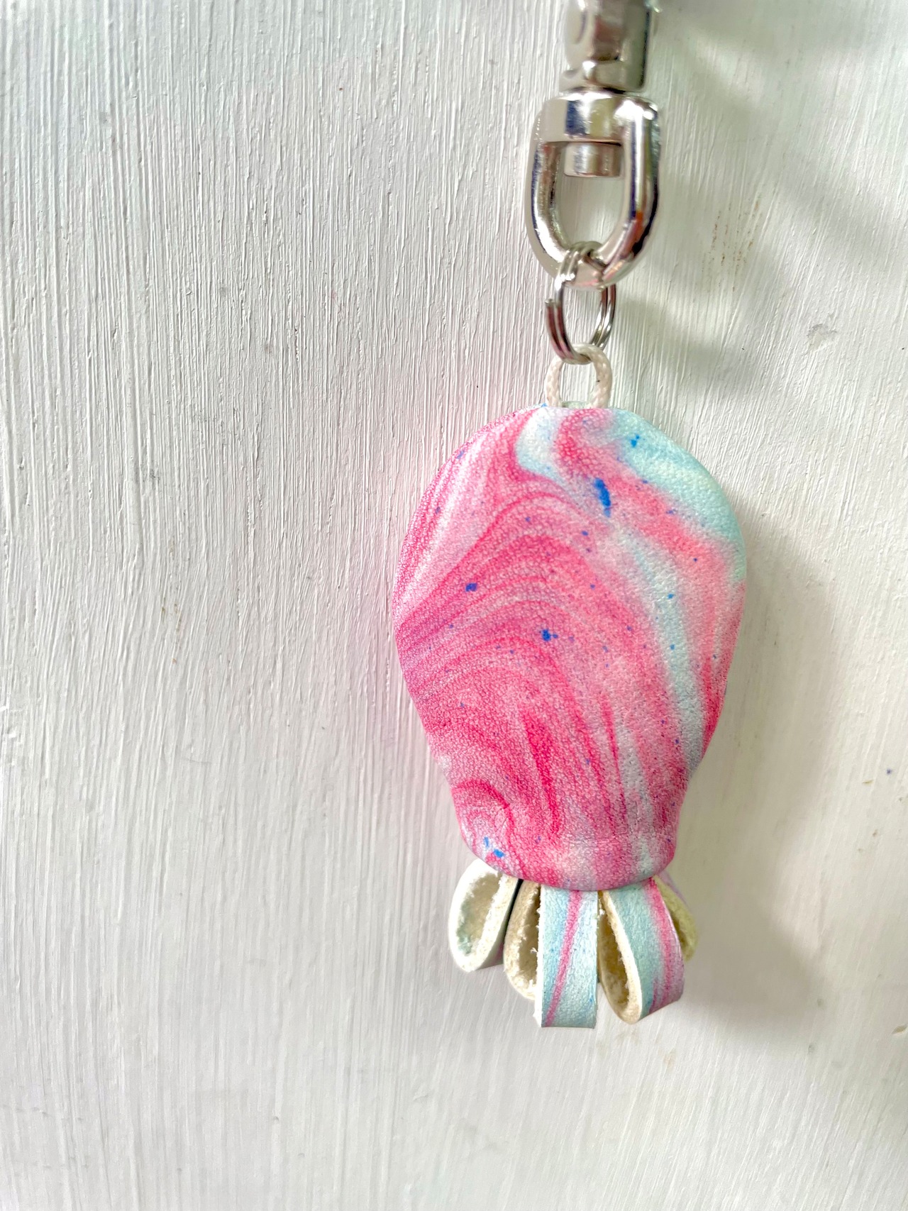 *こちらは留め具が細い金具仕様です。ファスナーの引手やDカン、7mm程度の紐に取り付けられます。1cm以上の幅の紐に取り付ける場合は幅広の金具(大)の方をおすすめしています。