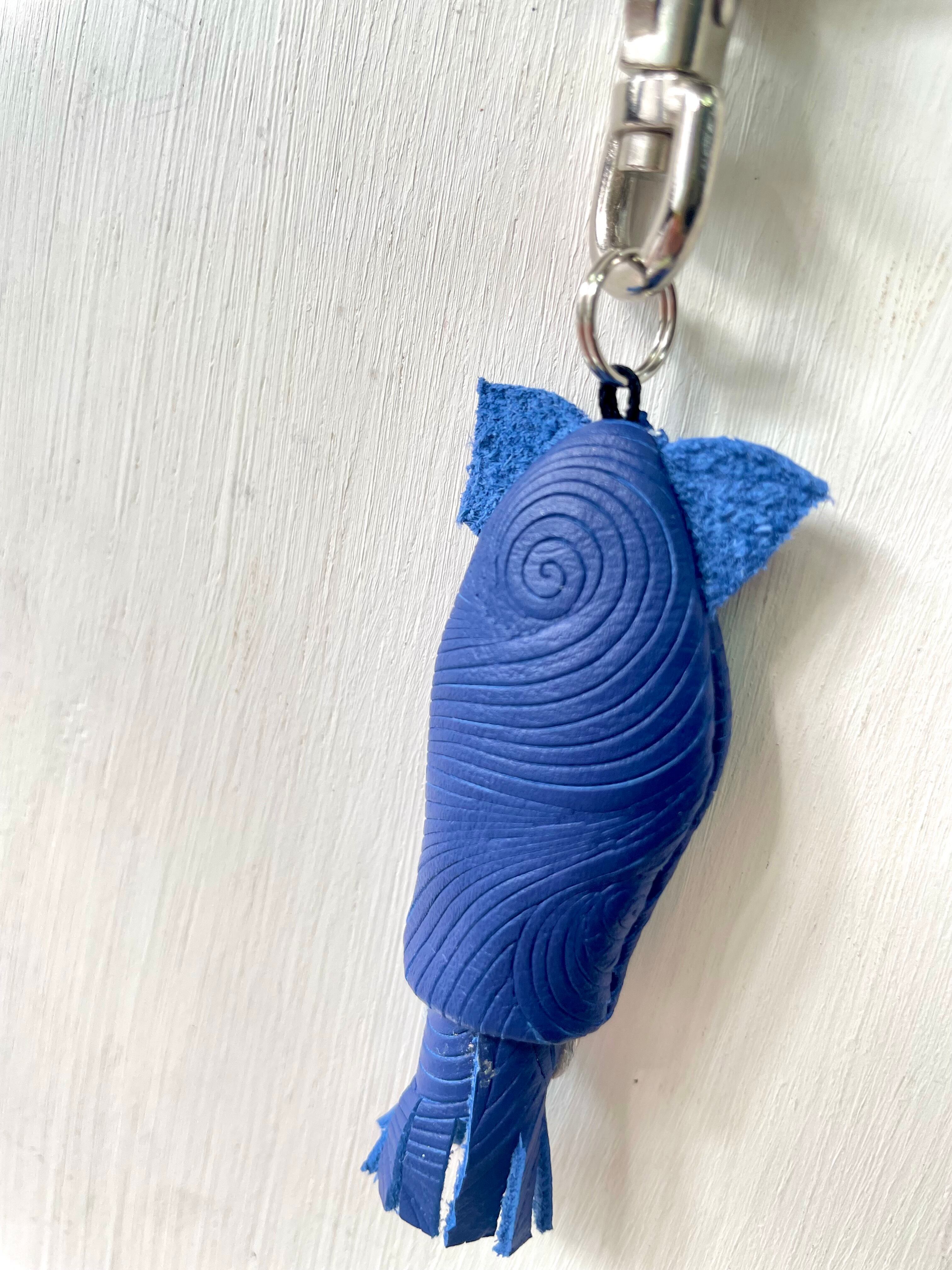 こちらは発色の良いマットなアオ色のレザーに渦巻きのような型押しがしてある面白い革です。