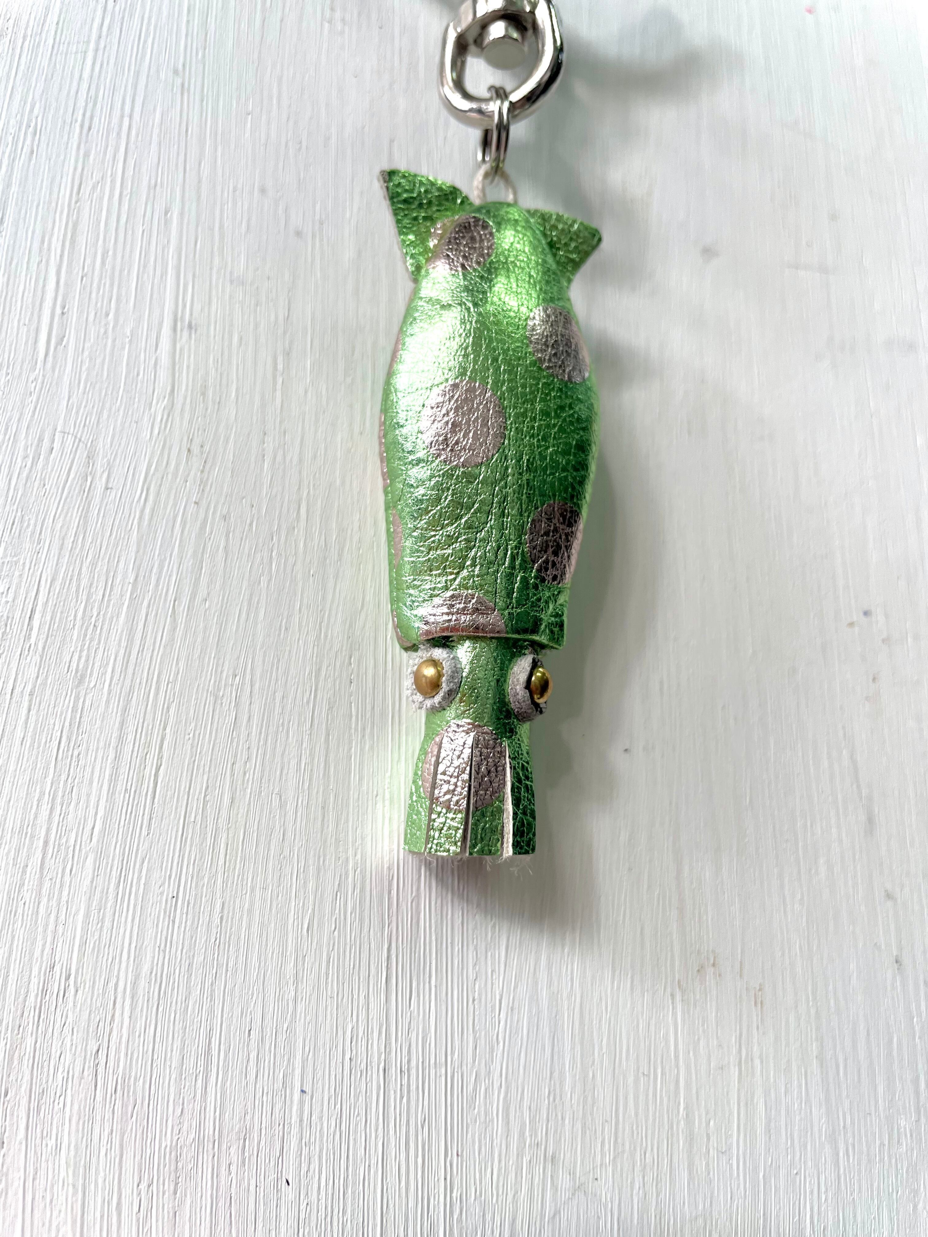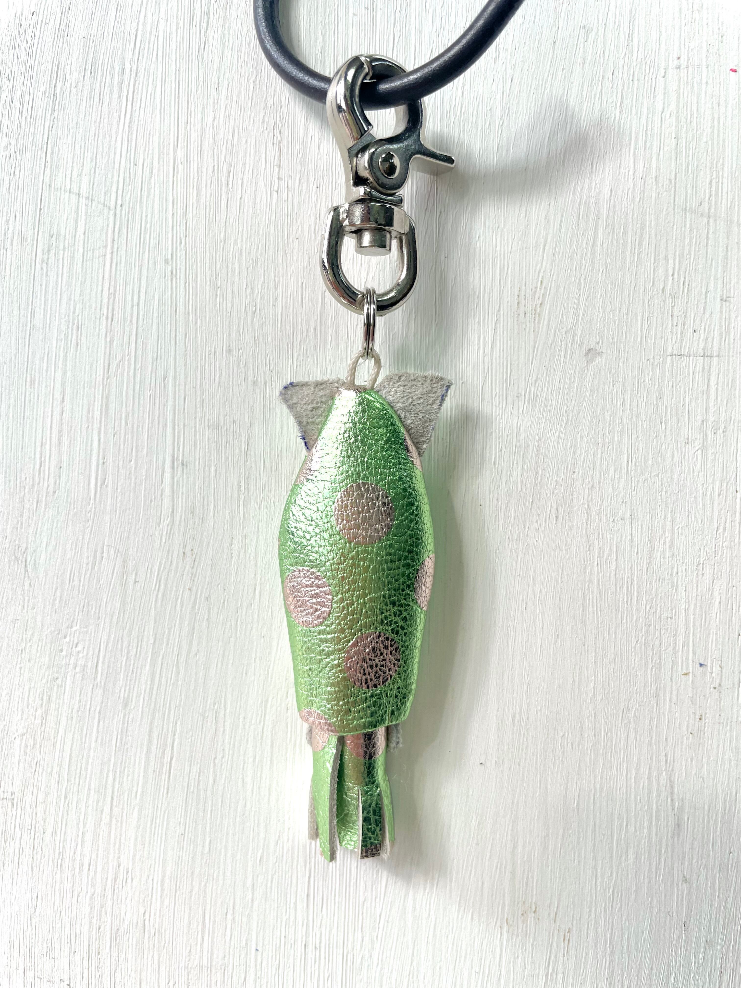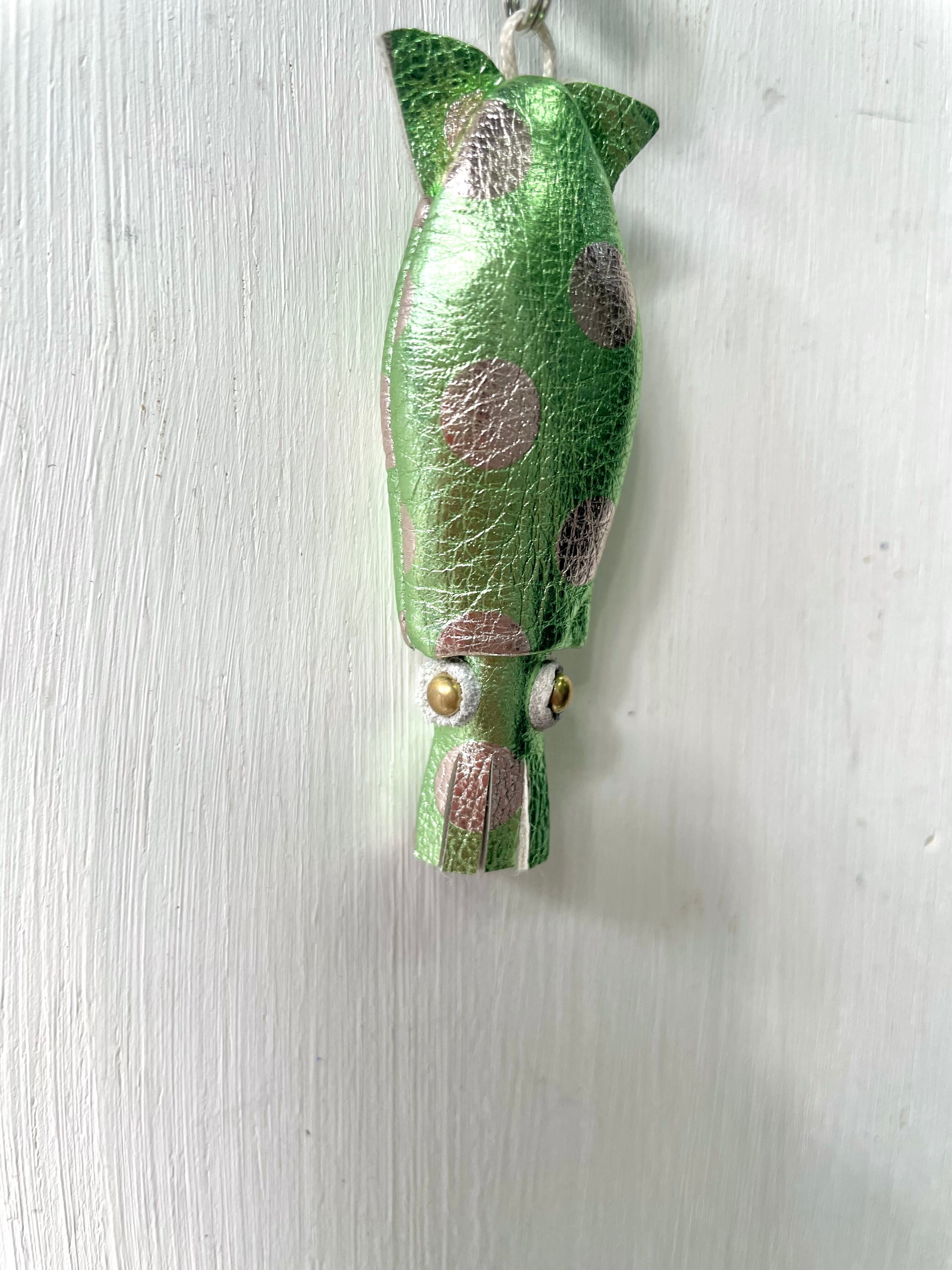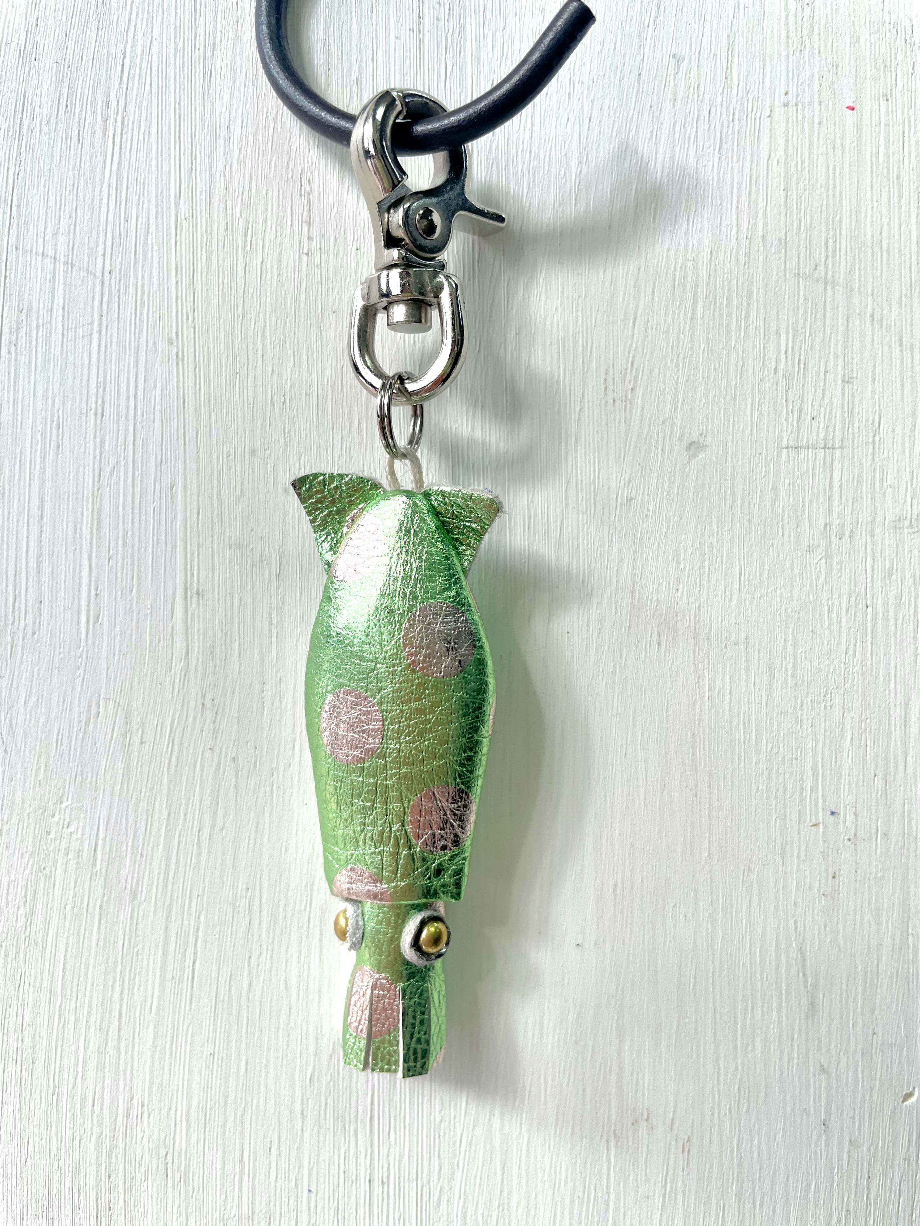 こちらはイエローグリーンのメタリックレザーに水玉が超絶かわいいレザーを使用。