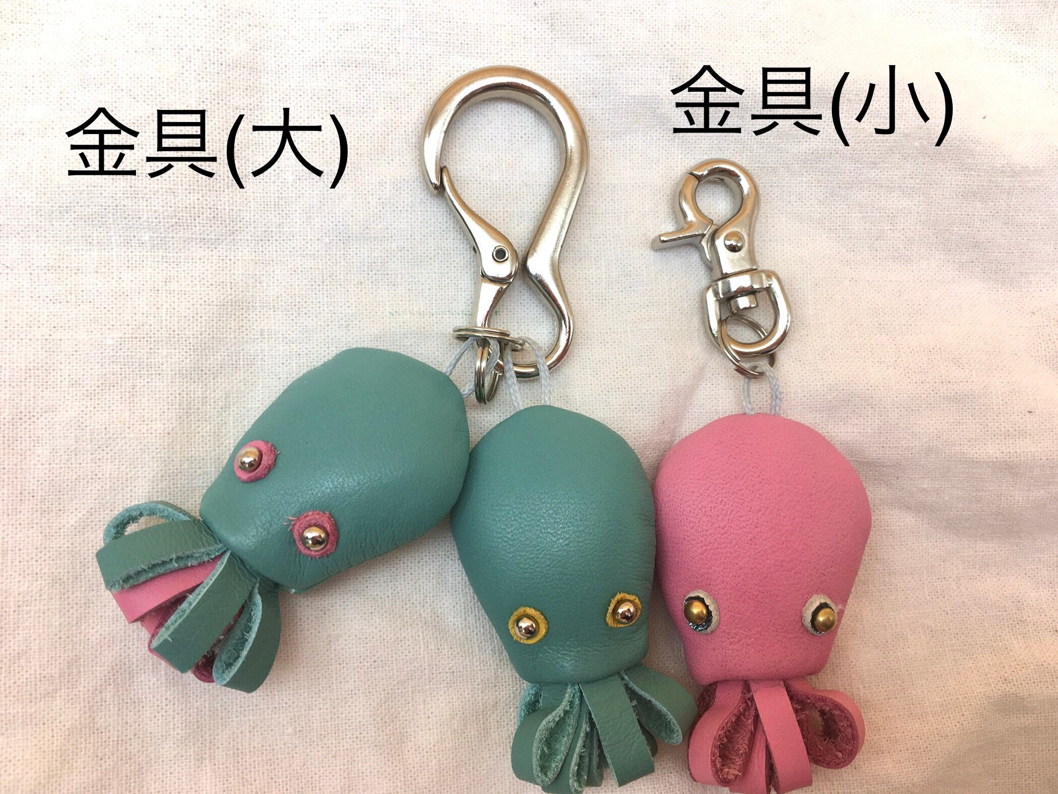 *こちらは留め具が細い金具仕様です。ファスナーの引手やDカン、7mm程度の紐に取り付けられます。1cm以上の幅の紐に取り付ける場合は幅広の金具(大)の方をおすすめしています。
