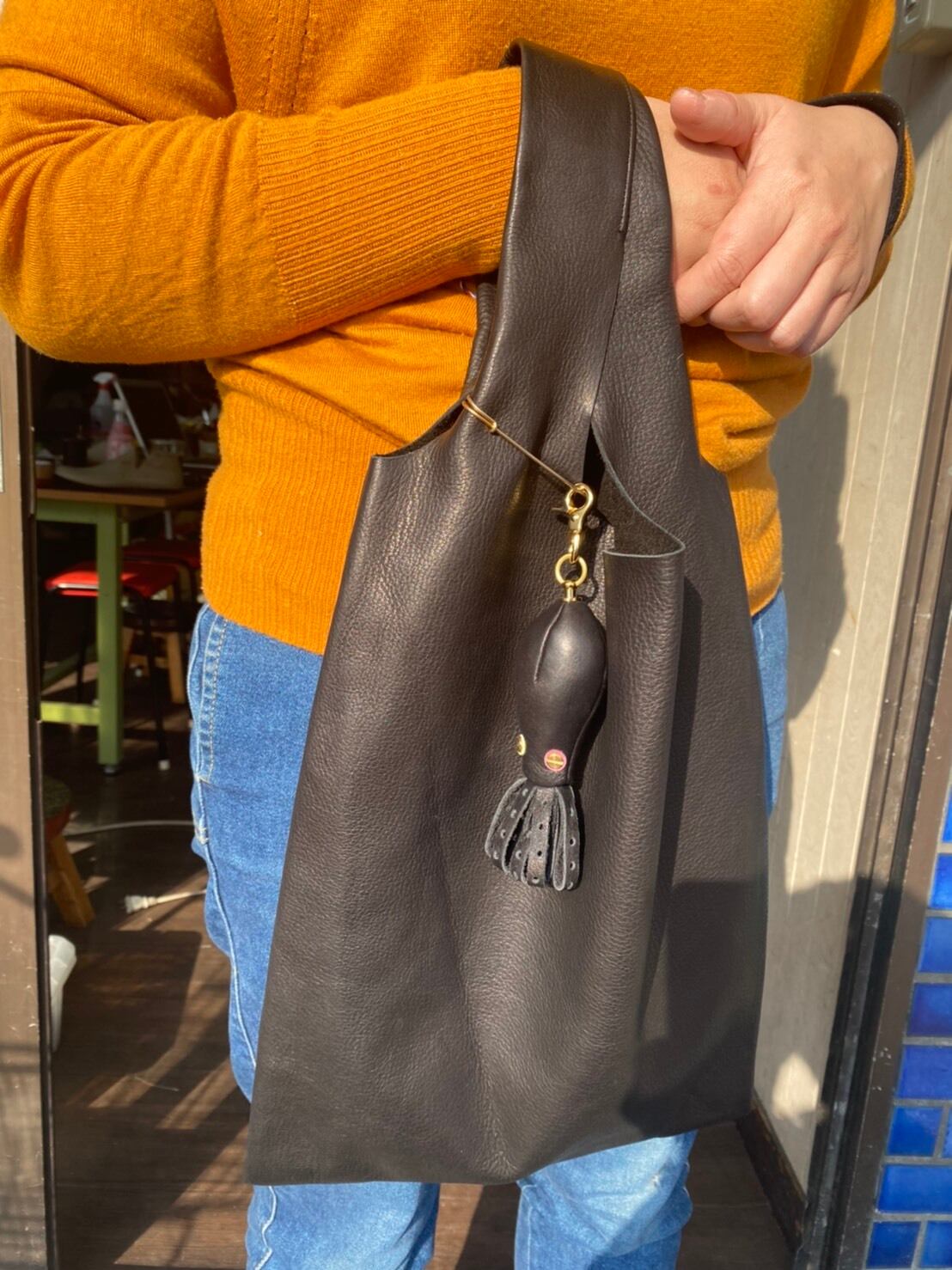 こちらはレザーエコバッグ(もも)と同じ革で作りました。