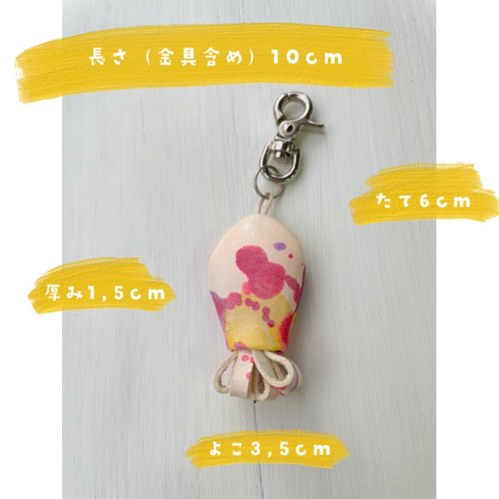 *こちらは留め具が細い金具仕様です。ファスナーの引手やDカン、7mm程度の紐に取り付けられます。1cm以上の幅の紐に取り付ける場合は幅広の金具(大)の方をおすすめしています。